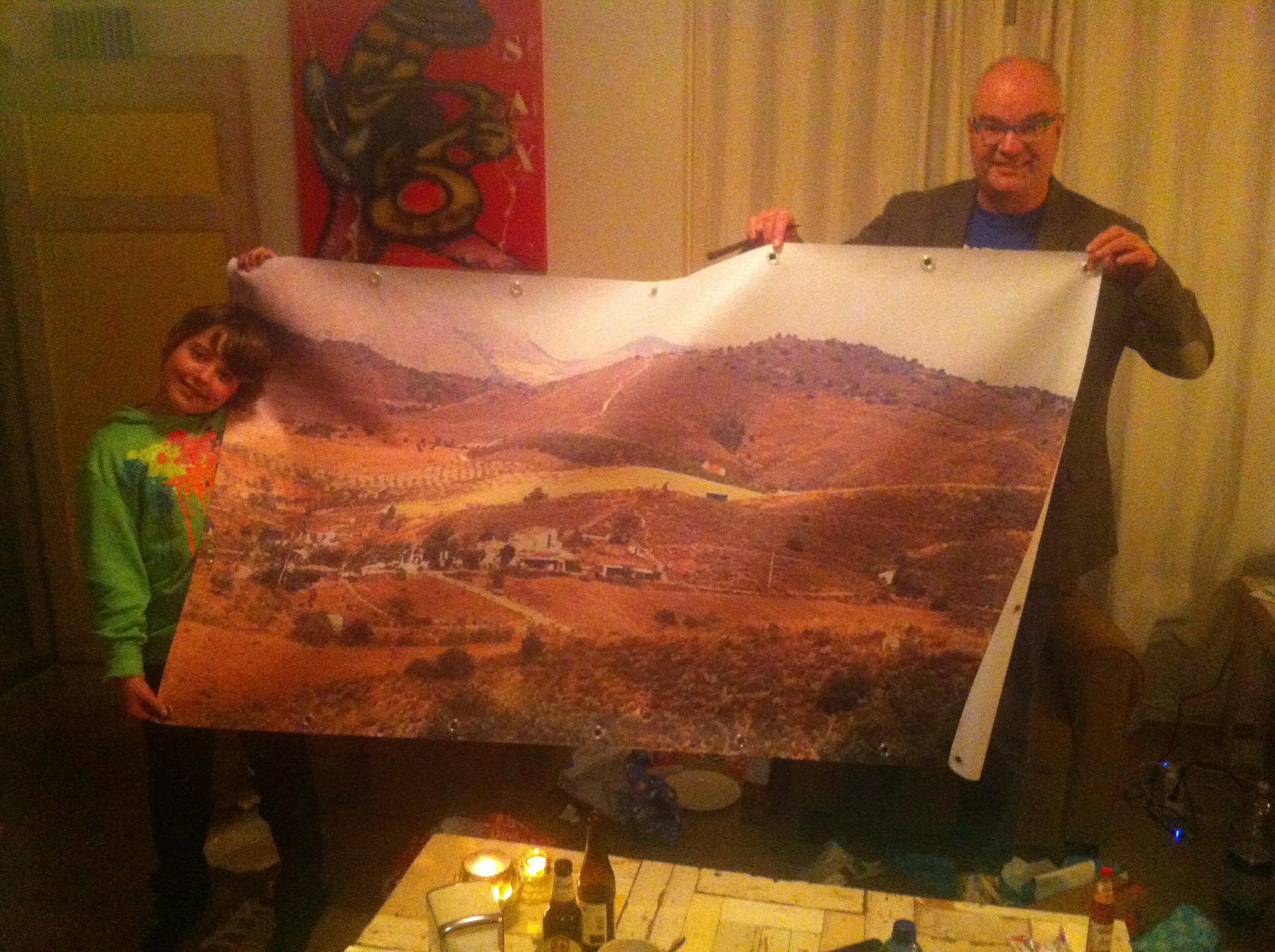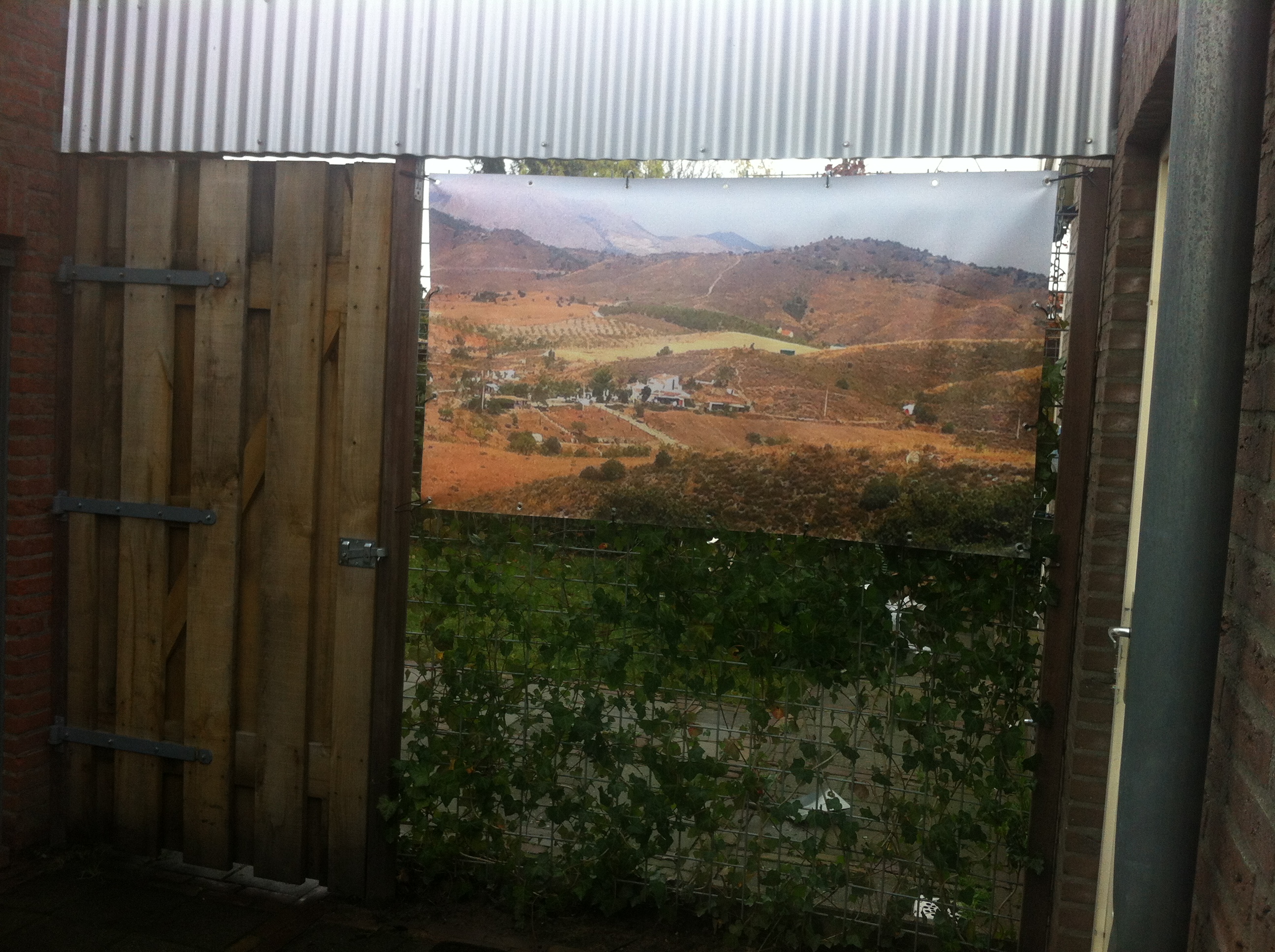 afgeschermd door klimop en een zeil met foto,