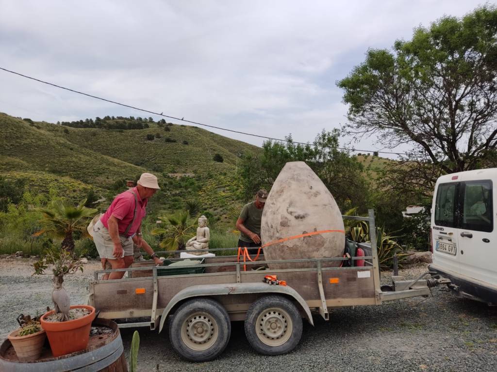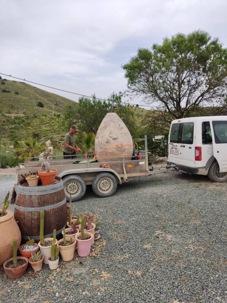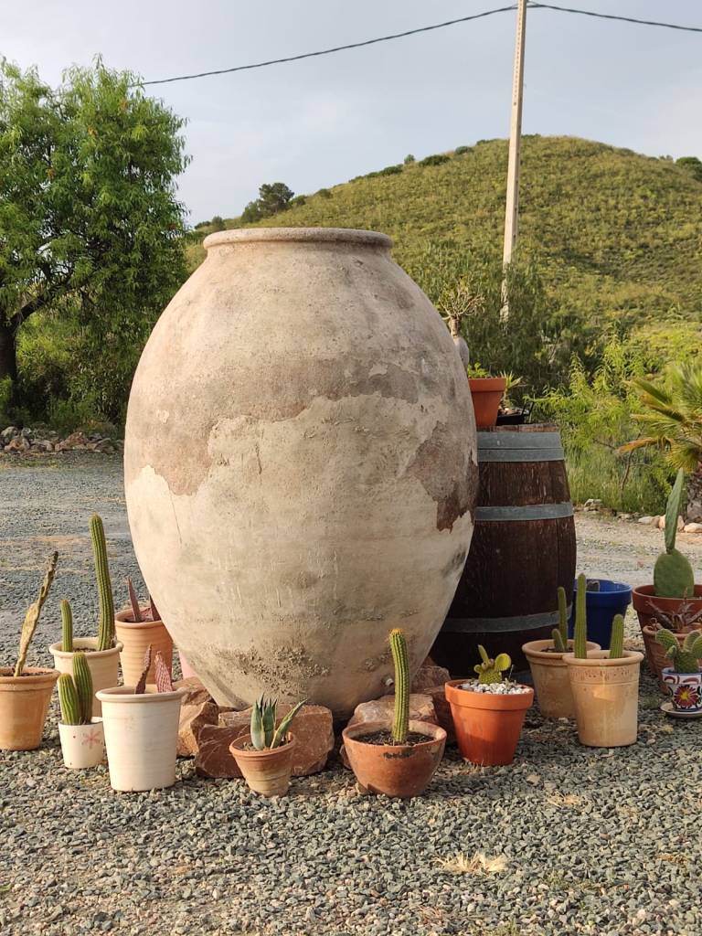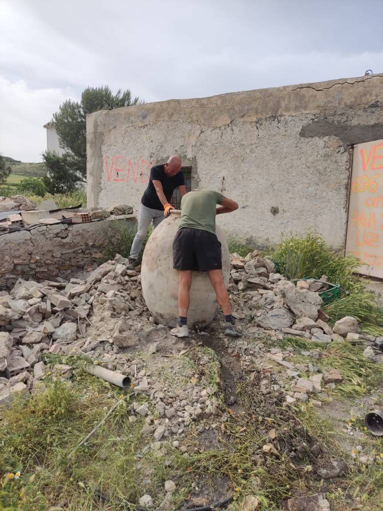 Denise had een leuke pot (een oude tinaja) gezien op facebook. Net voordat we aankwamen bij de cortijo zei de verkoper dat we hem nog wel even uit moesten graven…geen probleem dachten we, een beetje hakken doen we wel vaker .. er zat echter nog een cementen ring om. Die heeft Wil weggehakt met veel geduld. Ad heeft een pot die er al stond voordat de muren gemetseld waren doormidden moeten slijpen. Kortom enerverende zondagmiddag… Bedankt lieve mensen wederom ..