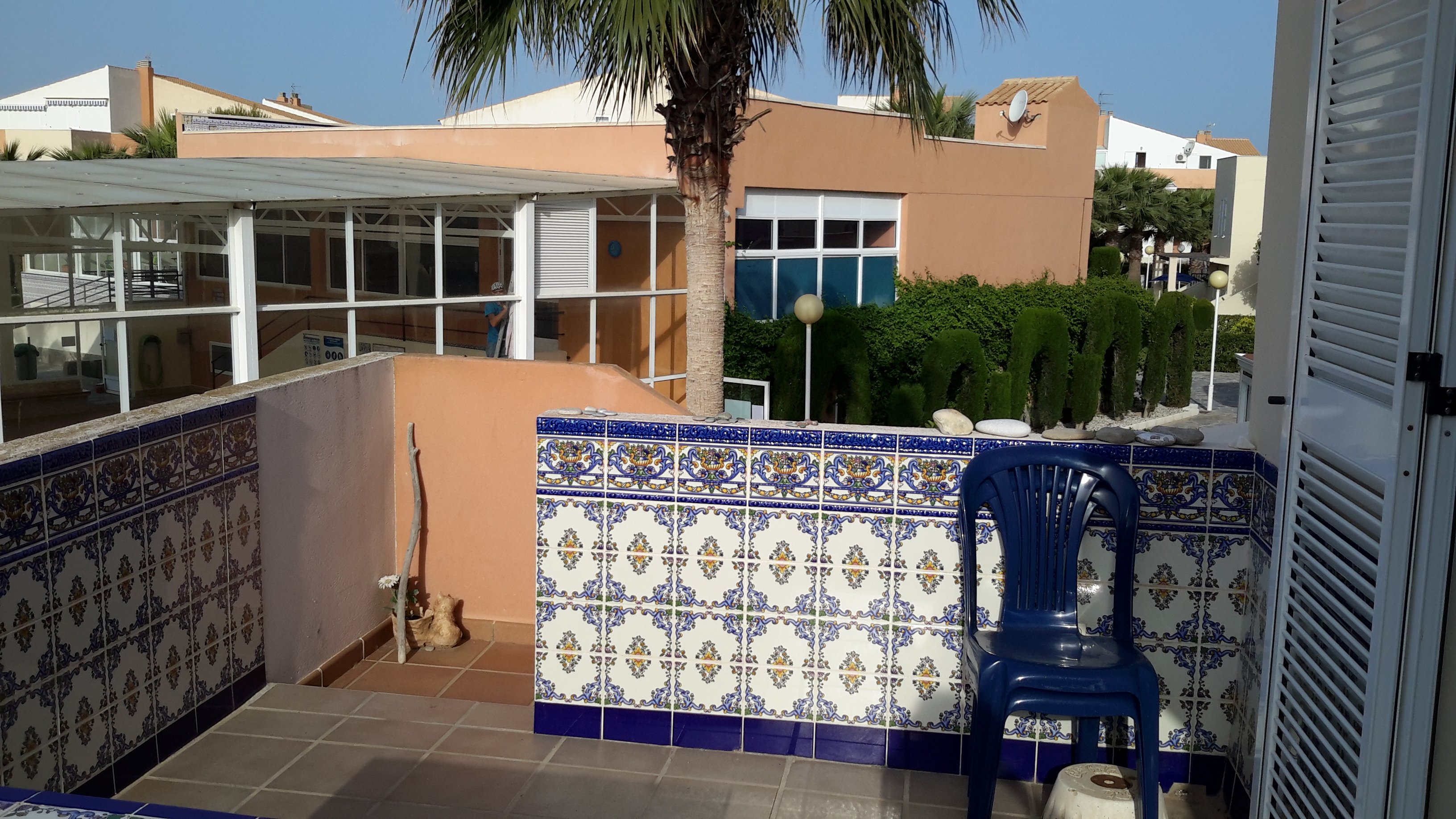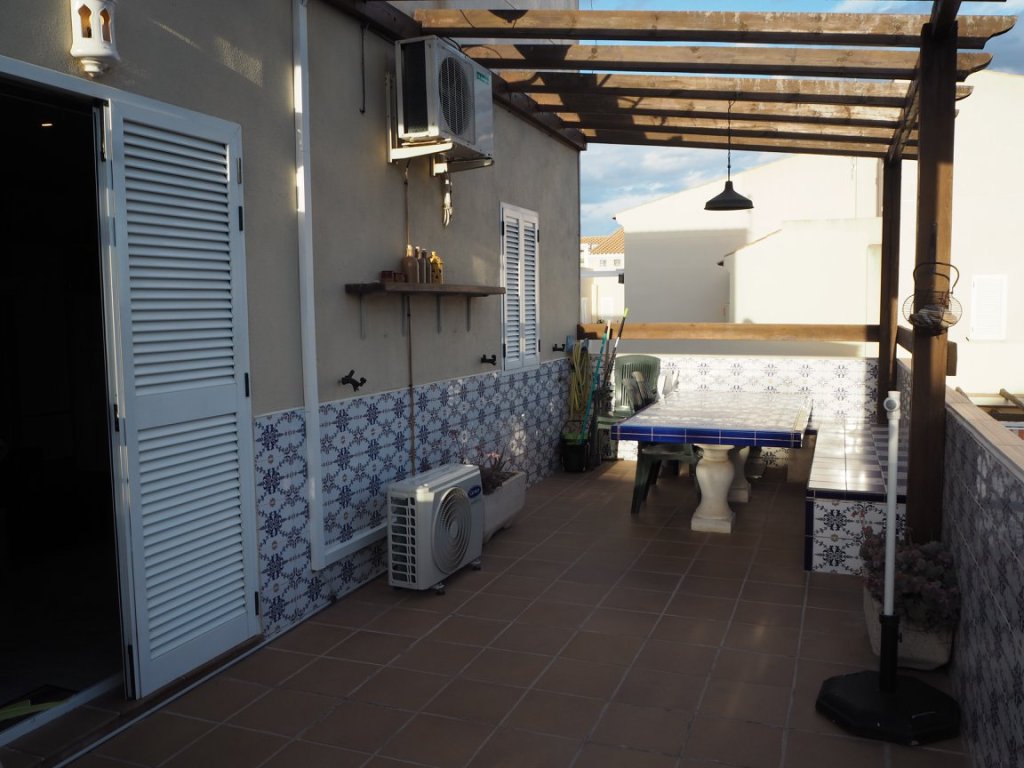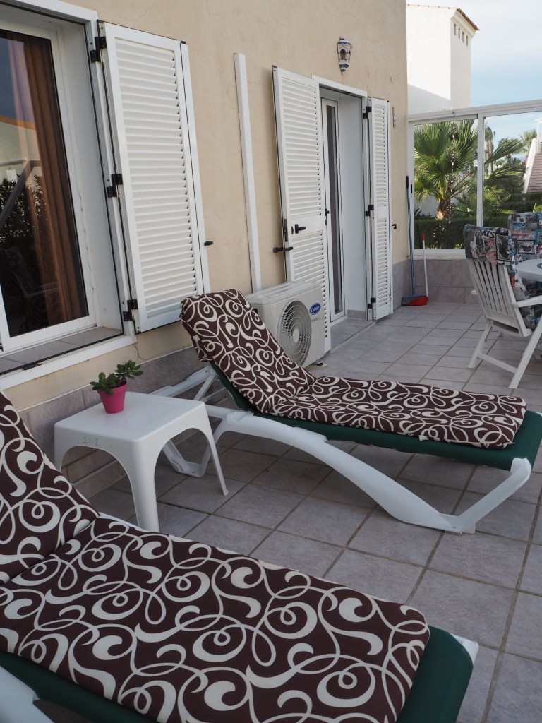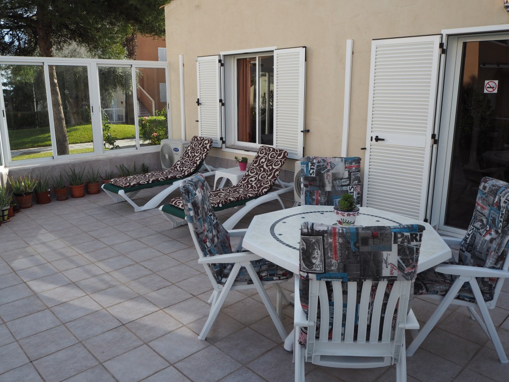 Op de bovenverdieping vind je de badkamer, twee grote tweepersoons slaapkamers en twee prachtige terrassen. Eén daarvan is bijzonder groot, met een eettafel en comfortabele ligbedden voor de perfecte momenten van ontspanning. Alle kamers zijn uitgerust met airconditioning en het appartement heeft bovendien een eigen overkapte parkeerplaats.