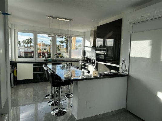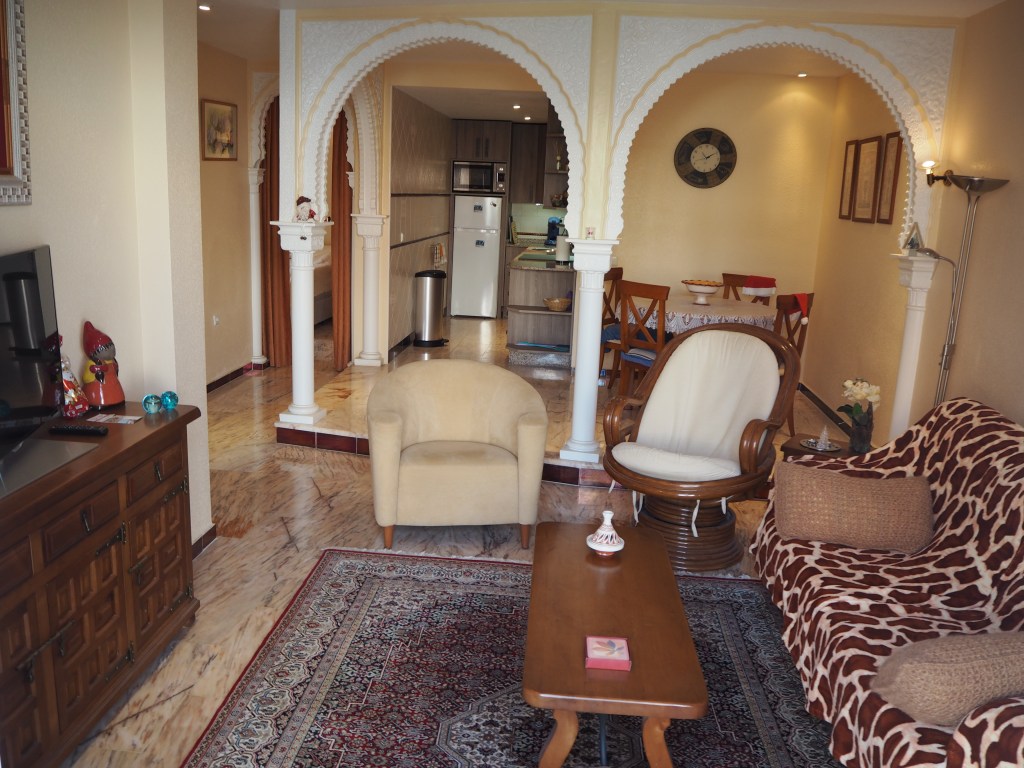 Casa La Sonrisa is een heerlijk ruim appartement met twee slaapkamers. De ingang bevindt zich op de eerste verdieping, waar je ook een gezellig terras vindt met prachtig uitzicht. Binnenkomend stap je direct de ruime woonkamer binnen, voorzien van een grote tv, supersnel internet en veel opbergruimte. De open keuken is eveneens ruim en biedt volop opbergruimte, een inductie kookplaat, een grote koelkast, diepvries en oven, en natuurlijk alles wat je nodig hebt om lekker te koken: verschillende koffiezetapparaten, waterkoker, pannen en servies.