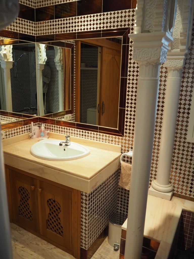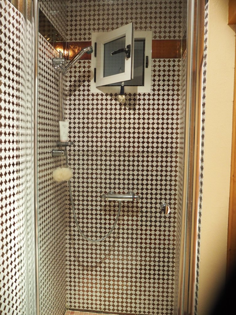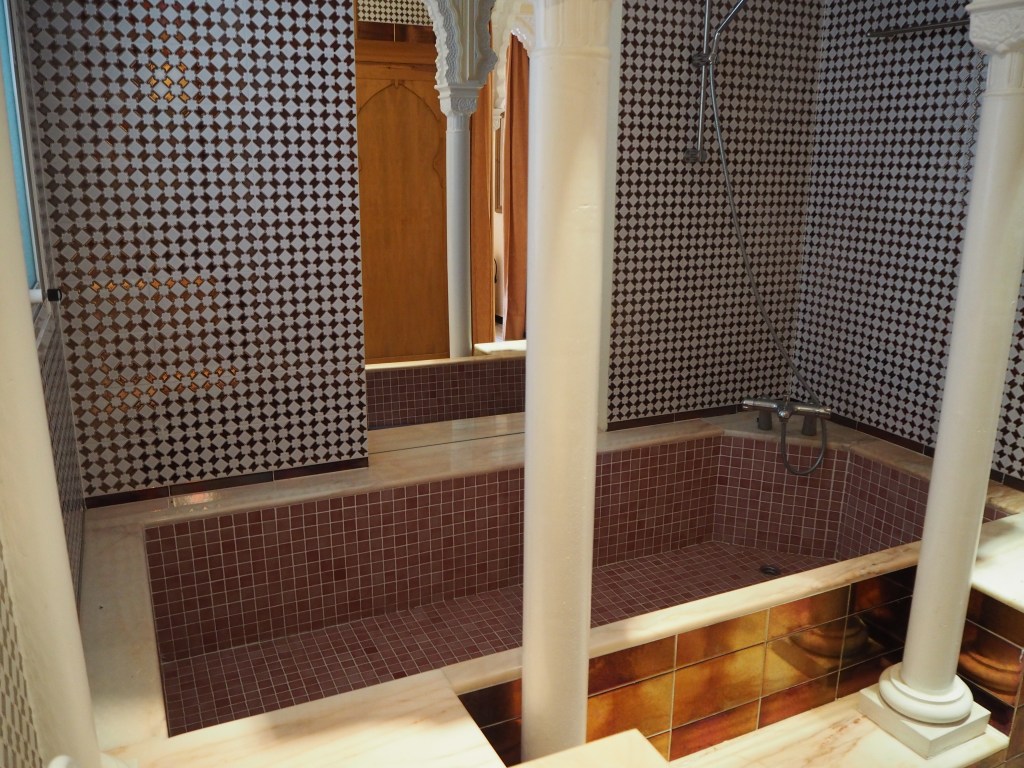 De badkamer is enorm en heeft een losse douche cabine, een zeer groot bad en een toilet en wastafel.