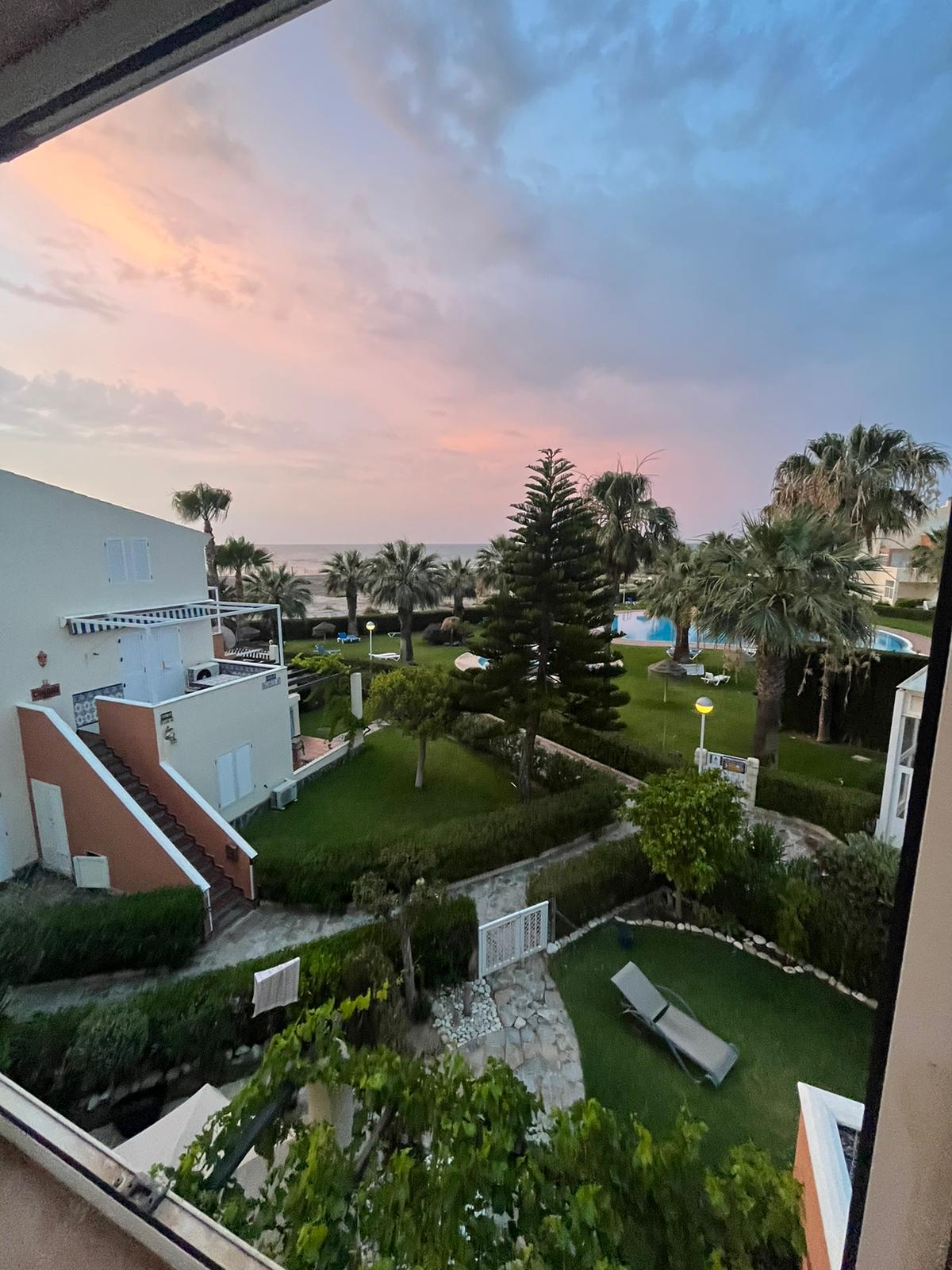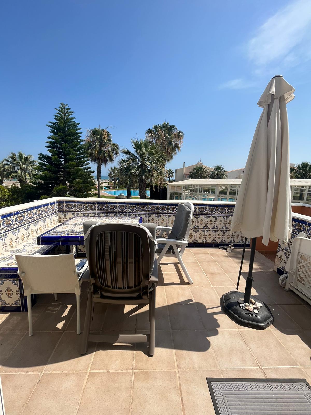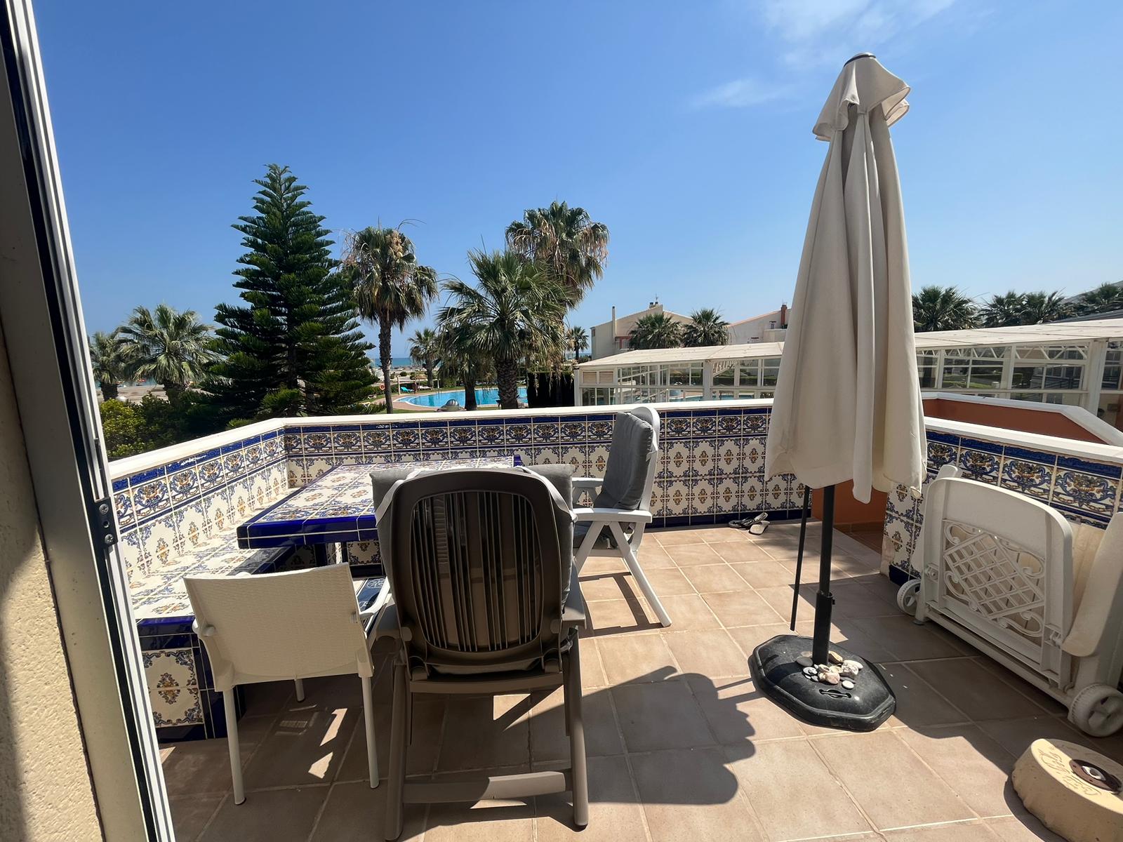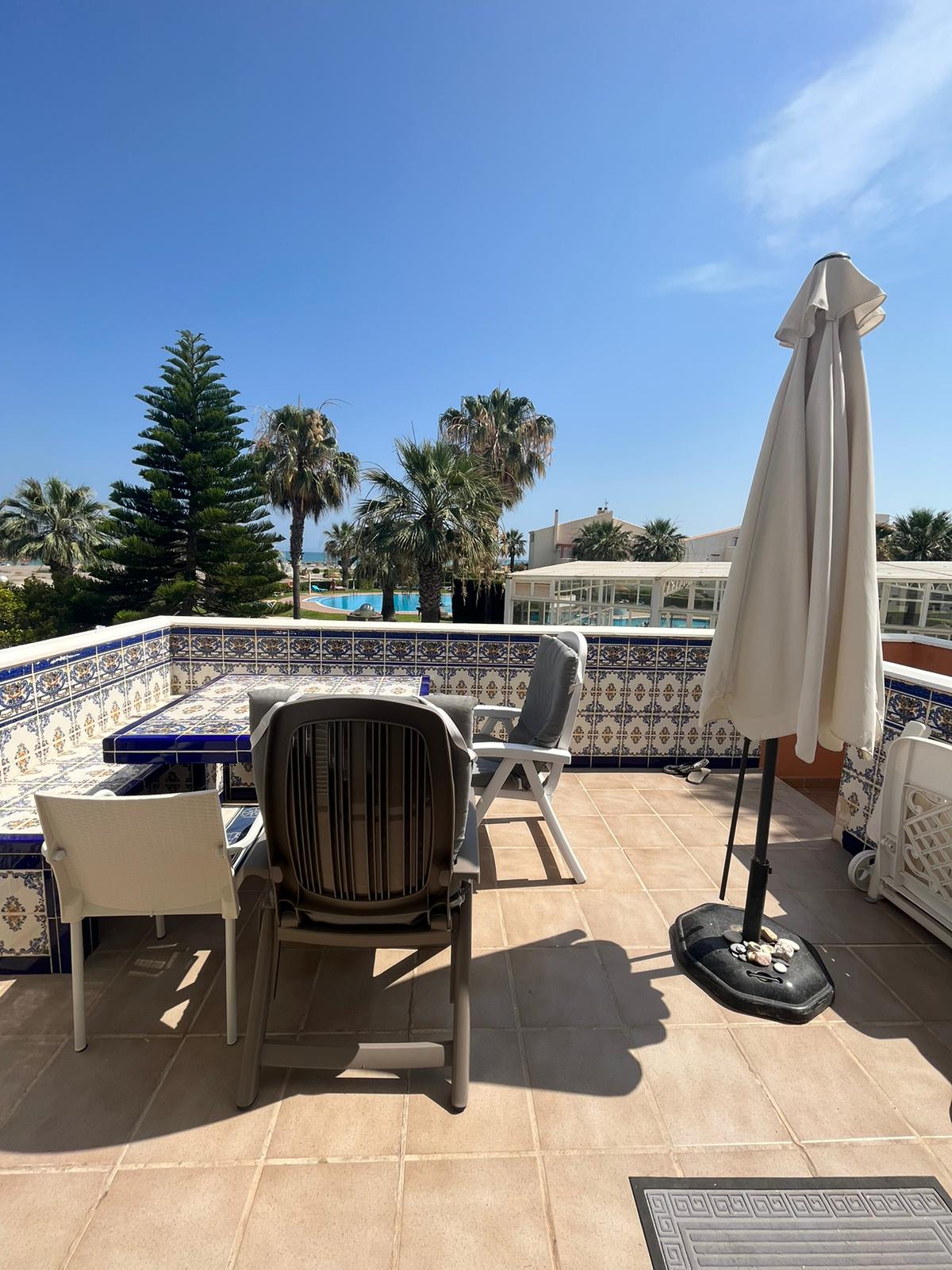 Je komt de duplex binnen via de buitentrap die uitkomt op het benedenterras met zicht over het zeer grote buiten zwembad met ligweide van Vera Natura en daarna over het strand.