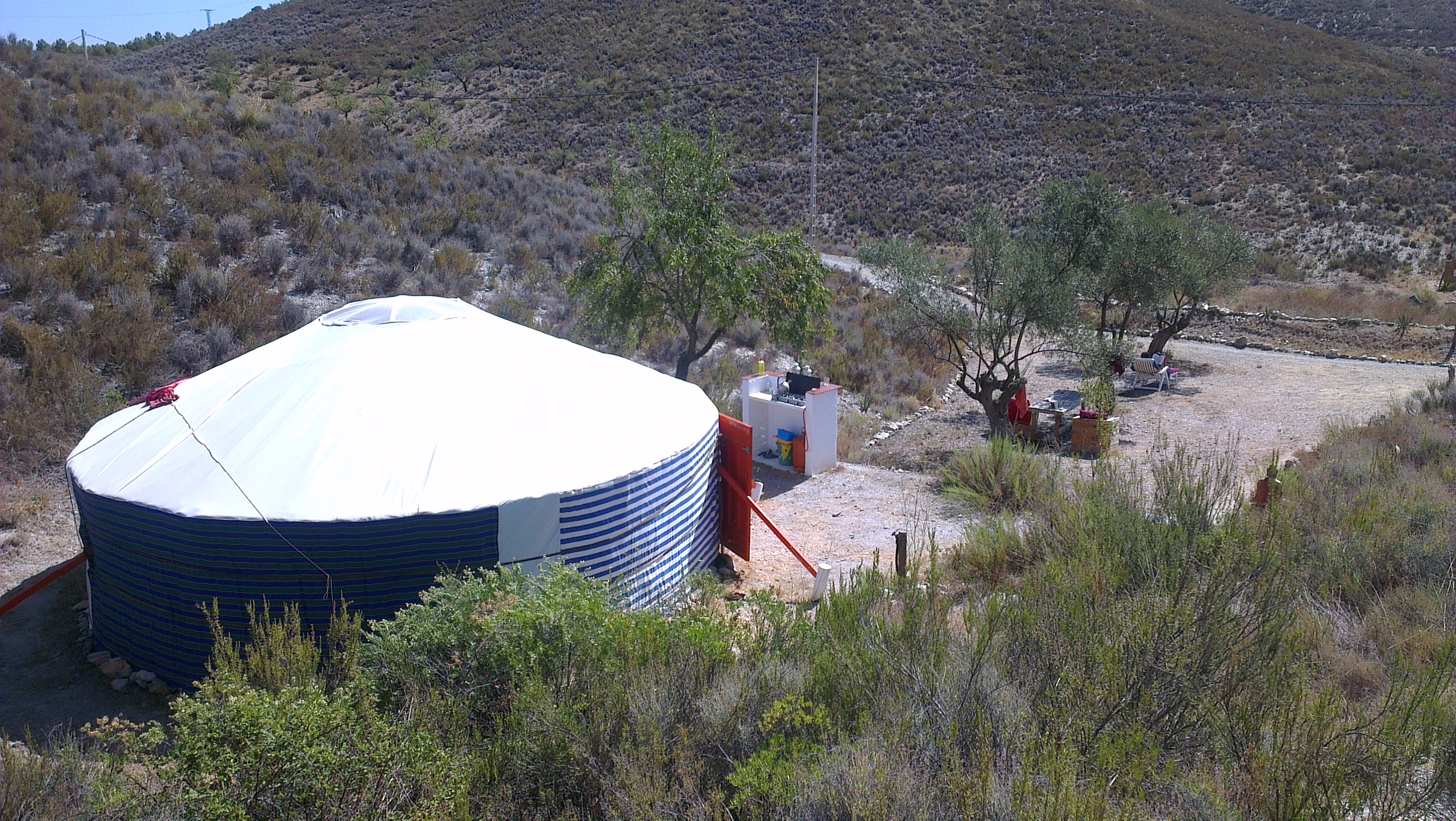 Een Yurt (wat simpelweg ‘huis’ in Turkse talenfamilies betekent) is afkomstig uit Centraal-Azië. In ons geval komt de yurt ofwel Ger (in het Mongools) uit Mongolië. Het is een ronde houten constructie bestaande uit talrijke houten stokken (oorspronkelijk is dit vaak wilg) die op een geniale manier samengehouden worden en aldus een ronde ruimte met een koepelvormig dak vormen. Het is het traditionele huis van alle nomadische volkeren van de Centraal-Aziatische steppes omdat het als woning heel makkelijk verplaatst kan worden. In relatie tot de ruimte die het creëert is er zeer weinig materiaal nodig en dus is het geheel gemakkelijk te transporteren. Desondanks is een yurt bestand tegen alle extreme weersomstandigheden. Niet voor niets dat het millennia heeft overleeft op de soms onherbergzame steppes. Voor het Spaanse weertype hebben wij de yurt nogmaals aangepast. Het vilt is vervangen door een dubbele laag canvas. Daarbij eist de zon regelmatig zijn tol op het doek en vervangen wij het doek bijna elk jaar. Het dak is niet meer van stof maar van hout met een groot raam waardoor u ´s nachts naar de sterren kunt kijken!